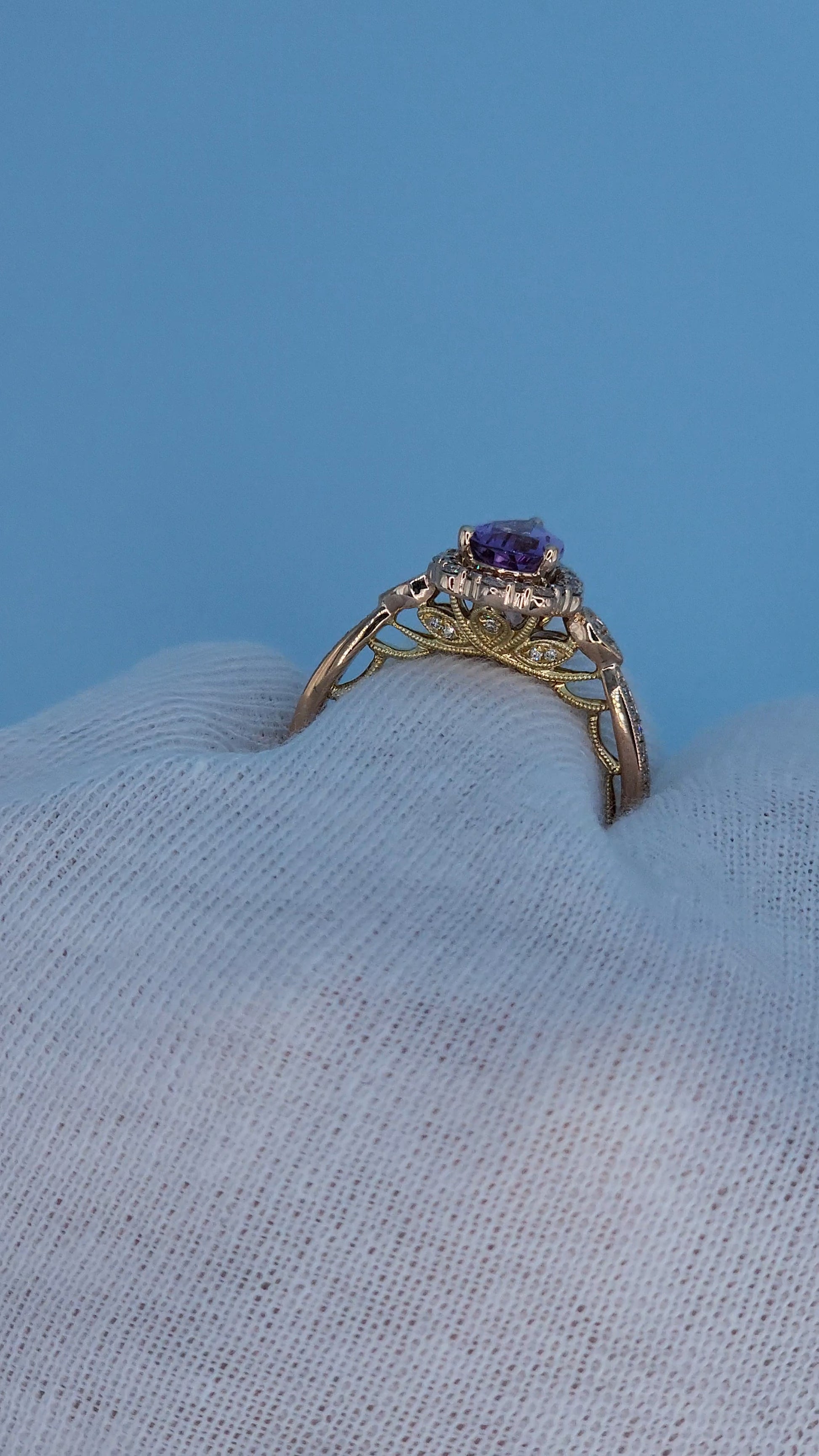 The band features intricate diamond accents and delicate milgrain detailing, enhancing the vintage-inspired aesthetic. Adding to its uniqueness, the ring showcases a yellow gold under-halo accented with diamonds and milgrain work, creating depth, contrast, and a luxurious two-tone finish.
