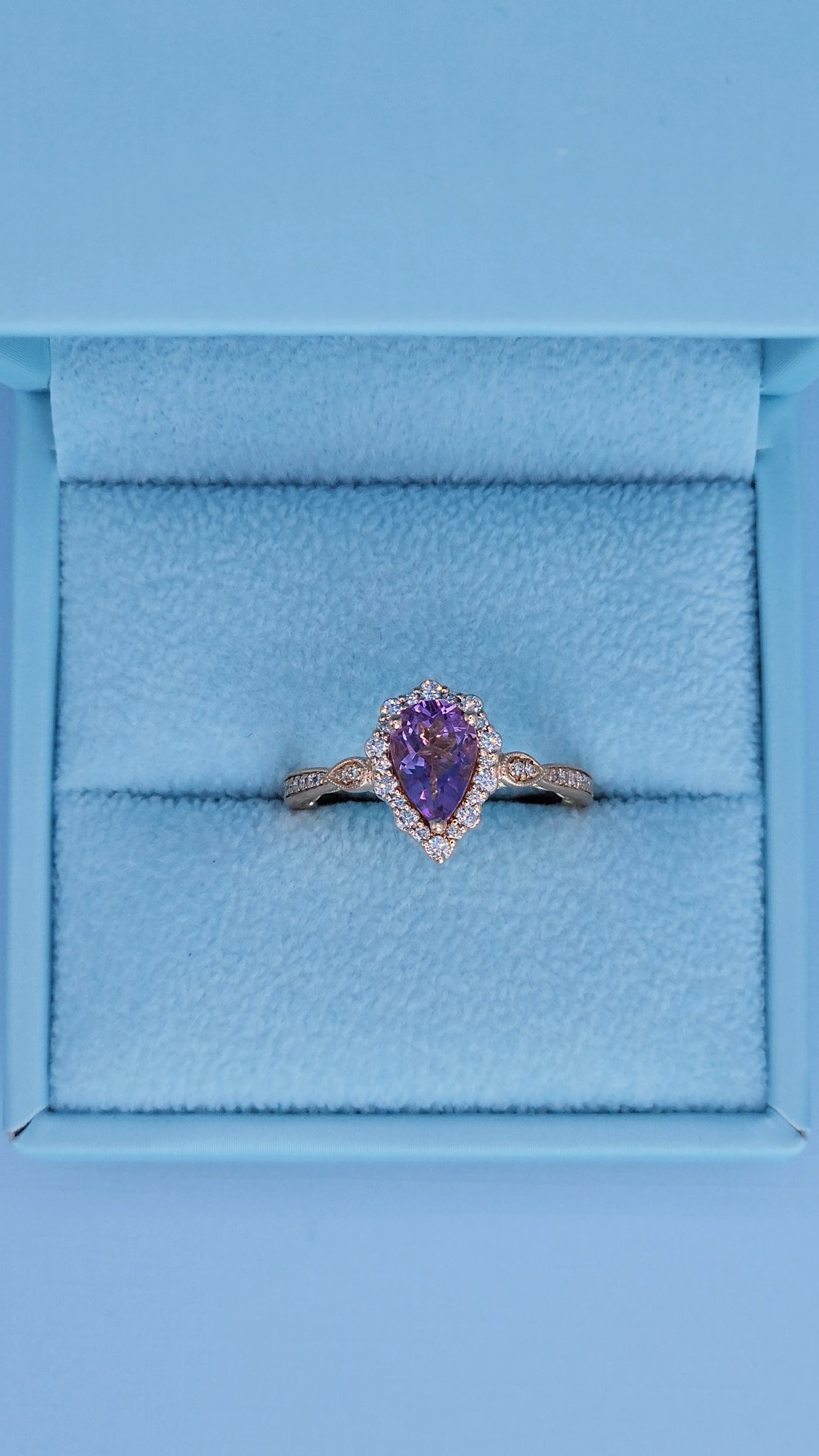 Zac Posen “Truly” 14k Rose Gold Amethyst Halo Ring | Pear Shape Birthstone Ring with Diamond Milgrain Accents